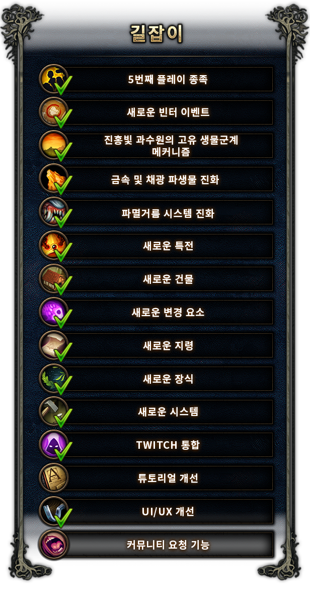 수백 가지 게임플레이 변경 요소와 각각의 개별 특성이 있는 5가지 생물군계가 있기에, 아무리 지략이 뛰어난 총독이라도 도시마다 다른 도전을 극복해야 합니다. 달라지는 기후에 맞게 전략을 조정하고, 다양한 건물 설계도와 특전을 조합하여 정착지를 번성하게 하거나 파괴하세요. 추가 목표를 달성하고 잠재적인 은혜를 받기 위해 위험한 숲 깊은 곳을 탐험할 수도 있고. 능력 안에서 도시를 운영하기 위해 조심스러운 접근 방법을 사용할 수도 있습니다. 내년에 상인이 어떤 상품을 가지고 올지 모르며 숲에는 보물과 자원이 있지만 고대의 위협도 도사리고 있습니다.