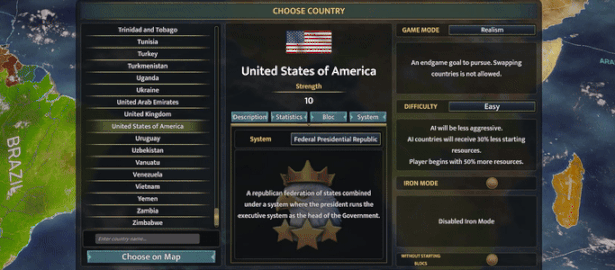 To achieve this ultimate goal, you will have to carefully consider a myriad of decisions, starting with the choice of a country you wish to lead. Any contemporary nation is available for your ambitions, from Afghanistan to Zimbabwe and everything in between.