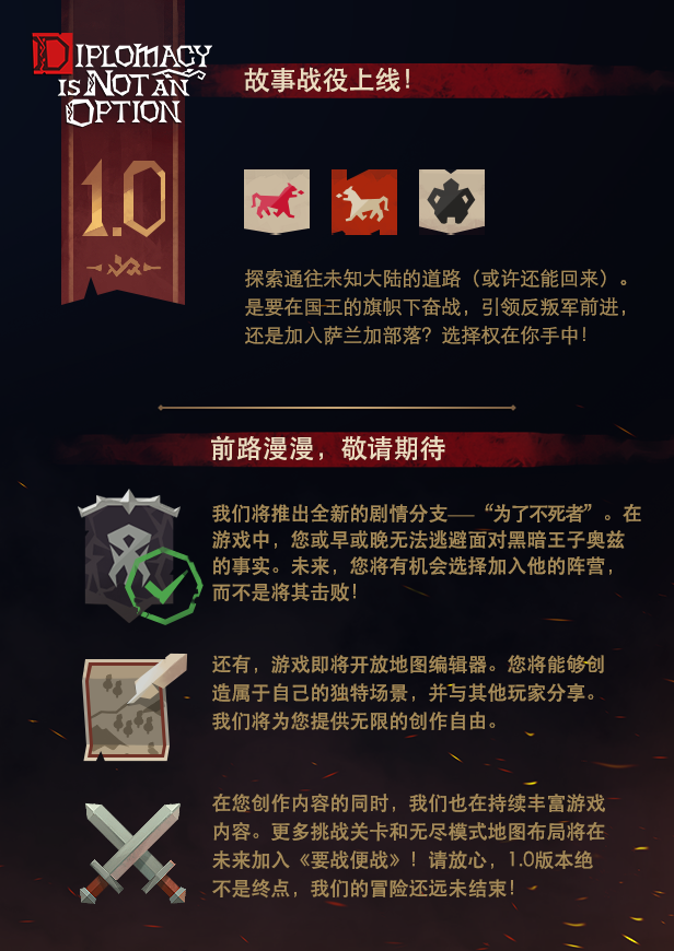 本游戏以自由为核心设计理念。在无尽模式、沙盒模式或挑战模式中,超越战役的局限性,用自己的方式粉碎敌人。在程序生成的地图上以自己独特的战术进行游戏。是选择尽早修建厚重的城墙并放置庞大的炮灰部队,还是进行追求贪婪增长和昂贵投资的宏观游戏?能在哪种风格中的游戏中取得成就感就取决于你自己。